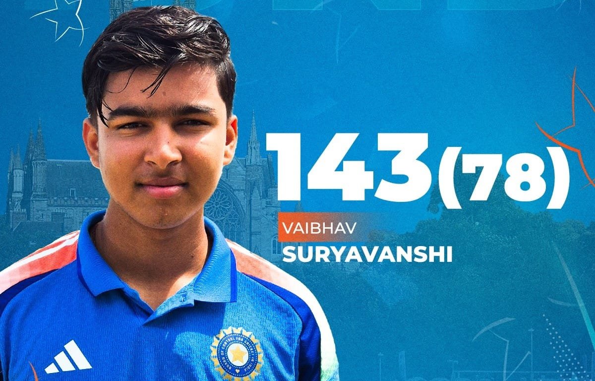 भारतका ओपनर सूर्यवंशीले ५२ बलमा शतक बनाउँदै युथ वनडे इतिहासकै सबैभन्दा छिटो शतक प्रहार गर्ने कीर्तिमान बनाएका हुन्। उनले कुल ७८ बलमा १३ चौका र १० छक्का सहित १४३ रन बनाए।