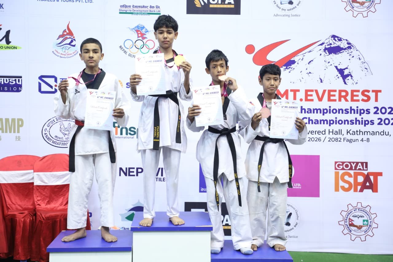 काठमाडौँ – चौथो माउन्ट एभरेस्ट अन्तर्राष्ट्रिय तेक्वान्दो प्रतियोगितामा नेपाली खेलाडीहरूले विभिन्न तौल समूहमा स्वर्ण, रजत र कांस्य पदक जित्दै उत्कृष्ट प्रदर्शन गरेका छन्। प्रतियोगिता नेपाल तेक्वान्दो संघको आयोजनामा सञ्चालन भइरहेको छ।