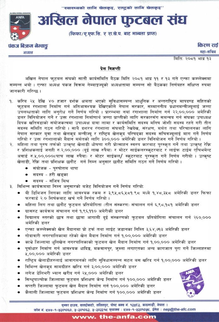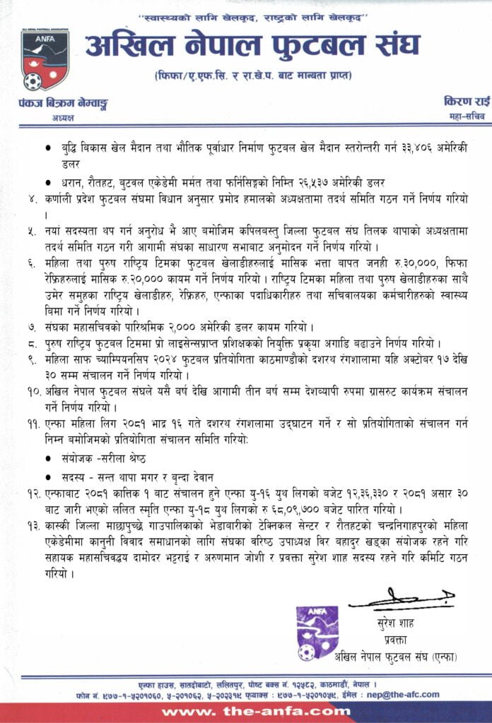 एन्फाका अध्यक्ष पंकज विक्रम नेम्वाङको अध्यक्षतामा बसेको बैठकले पारित गरेका निर्णयहरु: