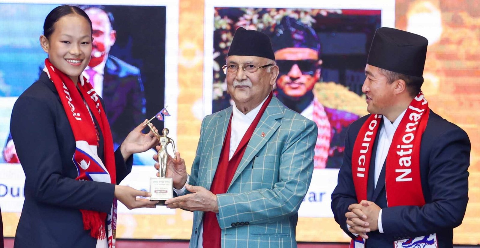 पलेसालाई दिइने रु ६५ लाख पुरस्कार कर नकटाइ छिट्टै दिइने जनाउँदै प्रधानमन्त्री ओलीले पुरस्कार घोषणा भएर प्राप्त नहुने रोग अब अन्त्य हुने स्पष्ट गर्नुभयो । “मौका पाएपछि नेपालीले गर्छ भनेर मैले भन्दै आएको छु । हामीले नयाँ नयाँ सफलता र कीर्तिमान (रेकर्ड) कायम गर्नुपर्छ । पुराना रेकर्डहरु तोड्दै जानुपर्छ । म सबै खेलाडीलाई भविष्यमा थप सफलता मिलोस् भन्ने शुभकामना दिन्छु ।” परिषद्का संरक्षकसमेत रहनुभएका प्रधानमन्त्री ओलीले भन्नुभयो, “हाम्रो अबको लक्ष्य जापानको ओलम्पिक खेल हुनुपर्छ । एसियन खेम लक्ष्य हुनुपर्छ । त्यसको तयारी राम्रोसँग होस् । त्यसअनुसारको तालिम र अभ्यास होस् भन्न चाहान्छु ।” प्रधानमन्त्री ओलीले कुनै पनि खेलमा प्रतियोगिताको अन्तिम समयसम्म जितिन्छ भन्ने दह्रो आत्मबल बनाएर आँटका साथ खेलेमा जित हासिल हुने विश्वास व्यक्त गर्नुभयो ।