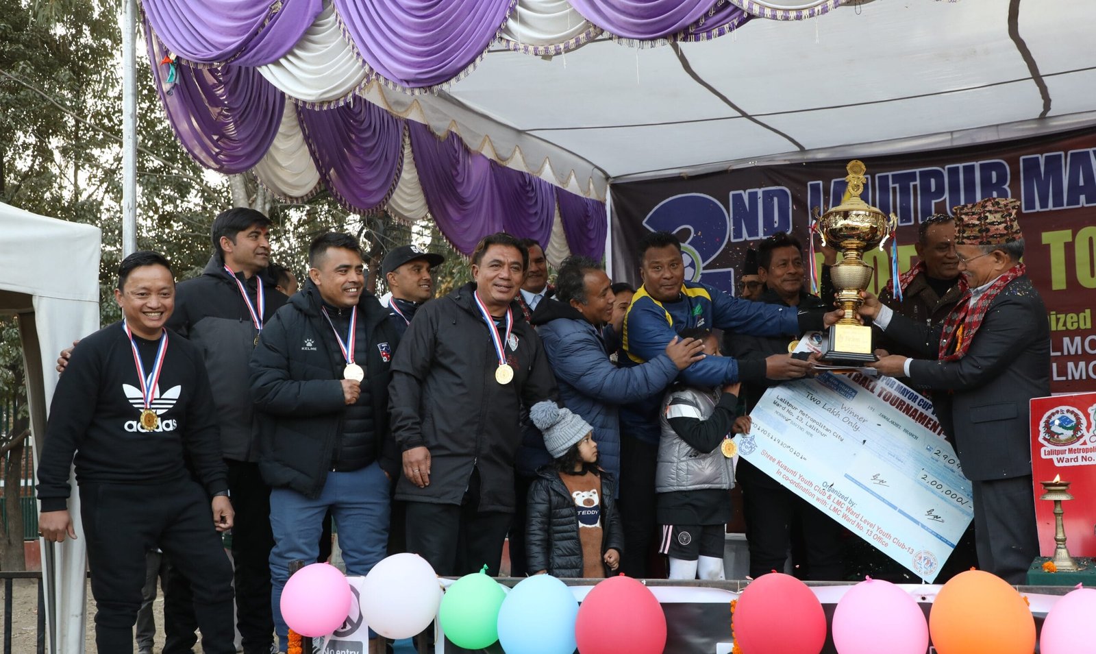 विजेतालाई ललितपुर महानगरपालिकाका मेयर चिरीबाबु महर्जन, अर्को आयोजक ललितपुर महानगरपालिका वडा १३ का अध्यक्ष गणेश केसी, आयोजक कुसुन्ती युवा क्लबका अध्यक्ष निरज खड्कालगायतले एक कार्यक्रमबीच पुरस्कृत गरे ।