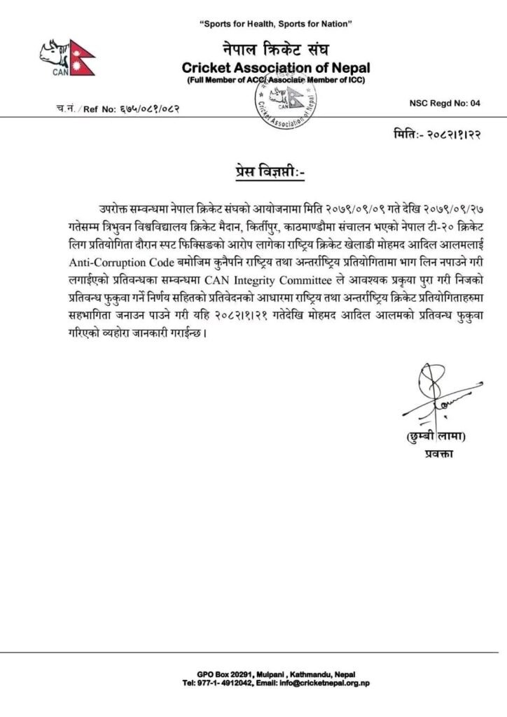 काठमाडौं । नेपाल क्रिकेट संघ (क्यान) ले क्रिकेटर मोहमद आदिल आलमको प्रतिवन्ध फुकुवा गरेको छ ।