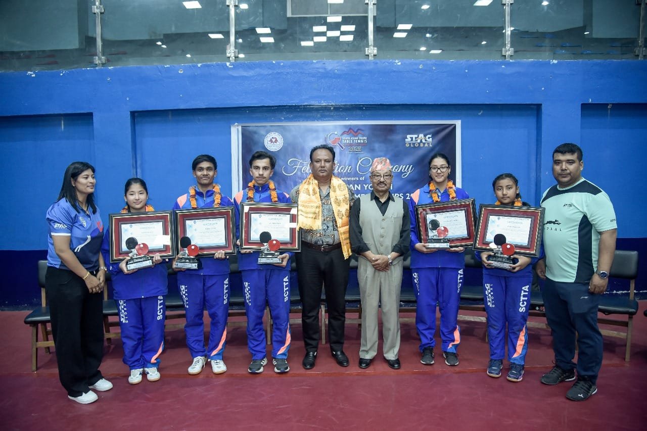 लैनचौरस्थित राष्ट्रिय टेबलटेनिस प्रशिक्षण केन्द्रमा गत वैशाख ११ देखि १४ गतेसम्म भएको प्रतियोगतामा नेपालले एक स्वर्ण, ६ रजत र ५ कांस्यसहित १२ पदक जितेको थियो । स्ट्याग च्याम्पियन्स टेबलटेनिस एकेडेमीले यु–१९ उमेर समूहमा गनञ्जय दाहाल र प्रवेश बस्नेत तथा यु–१५ मा पदक जित्ने शुभश्री श्रेष्ठ, प्राज्ना महर्जन र सुरम्या शाक्यलाई सम्मान गरेको हो ।