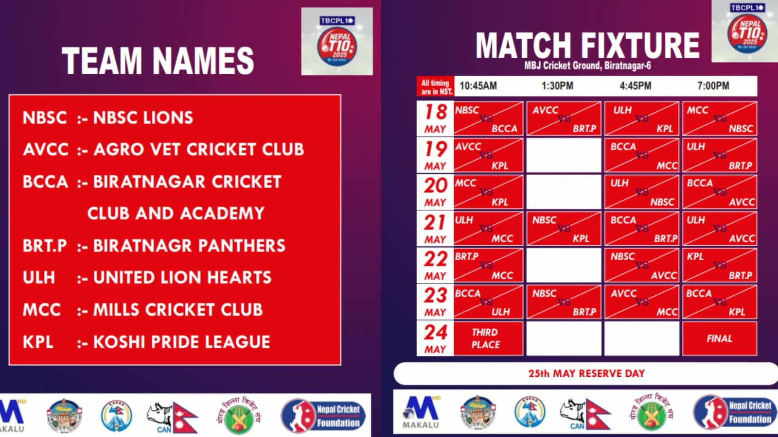 प्रतियोगिताको उद्घाटन खेल एन बि एस सि लायन्स र विराटनगर क्रिकेट क्ल्ब एकाडेमी बिच हुनेछ। खेल दिवा र रात्रिकालीन समयमा सञ्चालन हुनेछ । खेलको प्रत्यक्ष प्रसारण मकालु टेलिभिजन बाट हुनेछ।