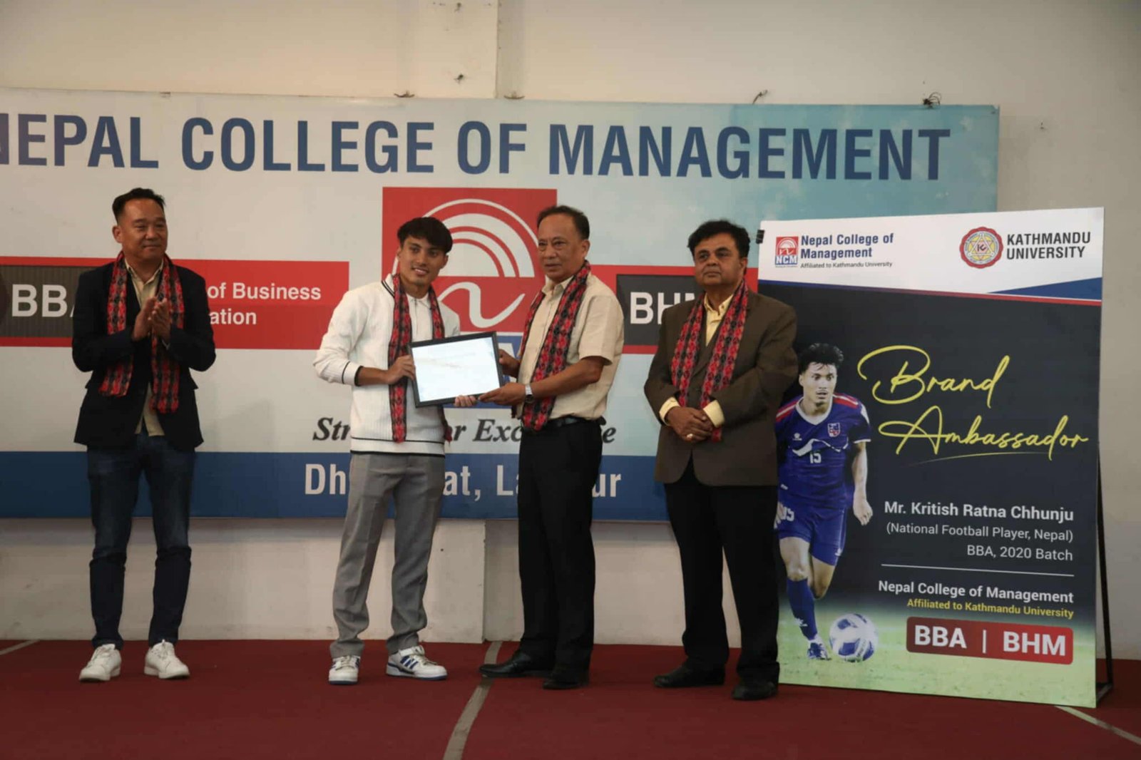 काठमाडौं। नेपाली राष्ट्रिय फुटबल टोलीका मिडफिल्डर कृतिशरत्न छुन्जु नेपाल कलेज अफ म्यानेजमेन्टको ब्रान्ड एम्बेसडरमा नियुक्त भएका छन्। कलेजले मंगलबार आफ्नै भवनमा उनलाई ब्रान्ड एम्बेसडरमा नियुक्त गरेको हो।